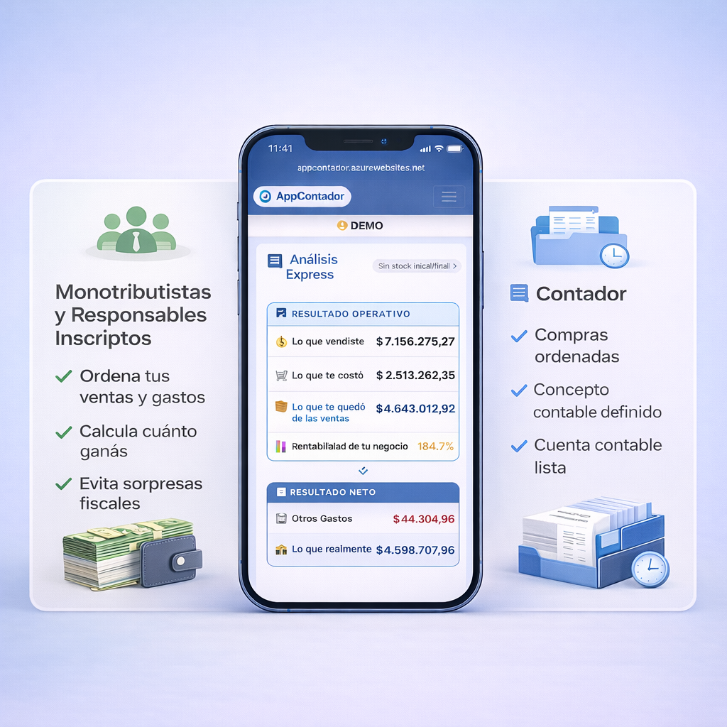 AppContador es una aplicación que combina tecnología y conocimiento contable para simplificar la gestión Monotributistas, Responsables Inscriptos y acompañar a profesionales y contadores.